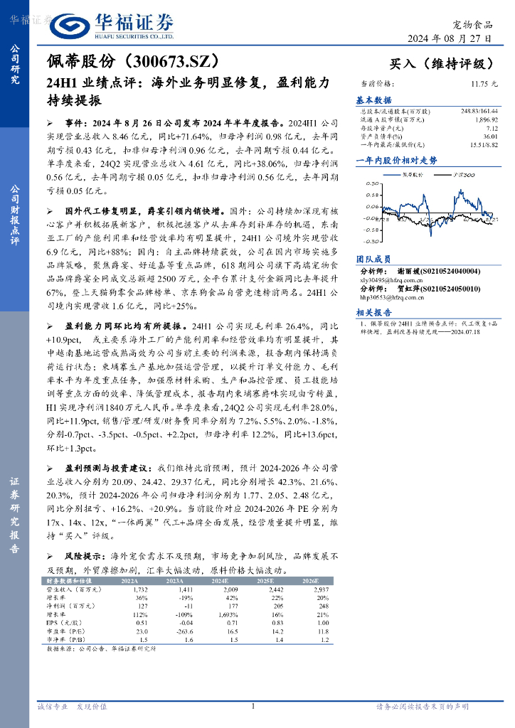 华福证券:佩蒂股份(300673)-24H1业绩点评:海外业务明显修复,盈利能力持续提振.pdf