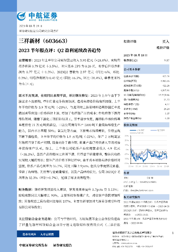 中航证券:三祥新材(603663)-2023半年报点评:Q2盈利延续改善趋势.pdf