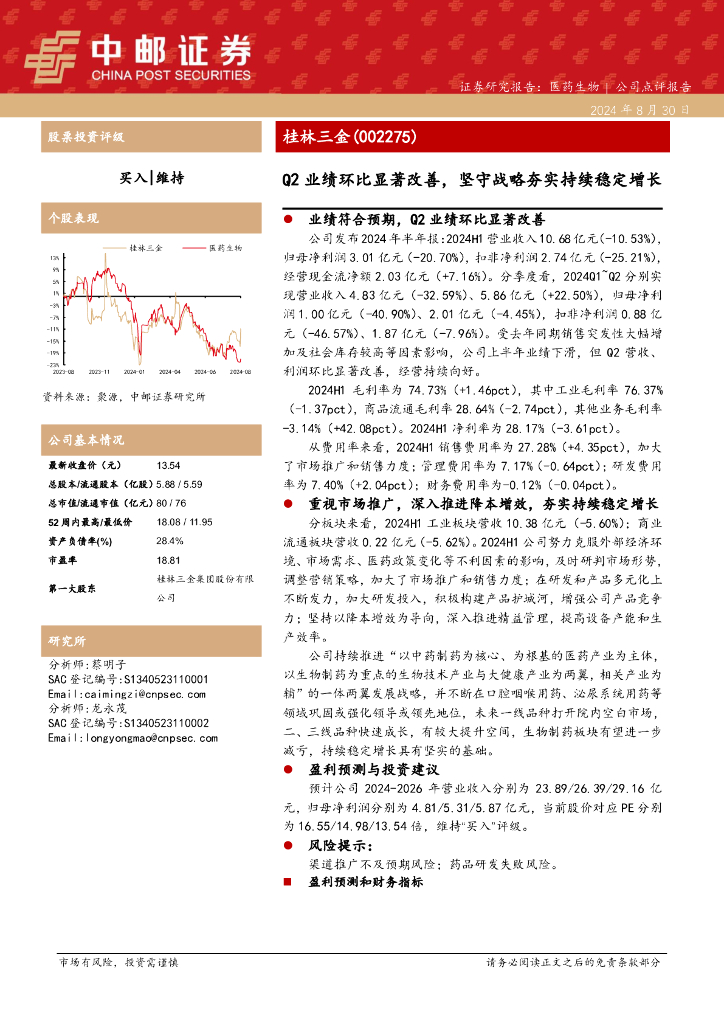 中邮证券:桂林三金(002275)-Q2业绩环比显著改善,坚守战略夯实持续稳定增长.pdf
