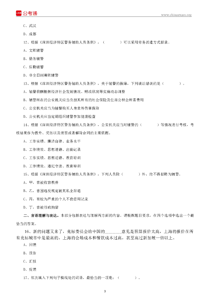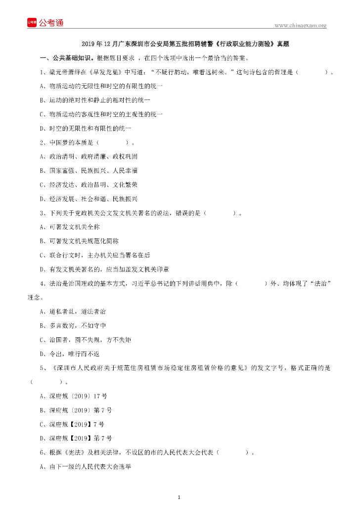 2019年12月广东深圳市公安局第五批招聘辅警《行政职业能力测验》真题.pdf