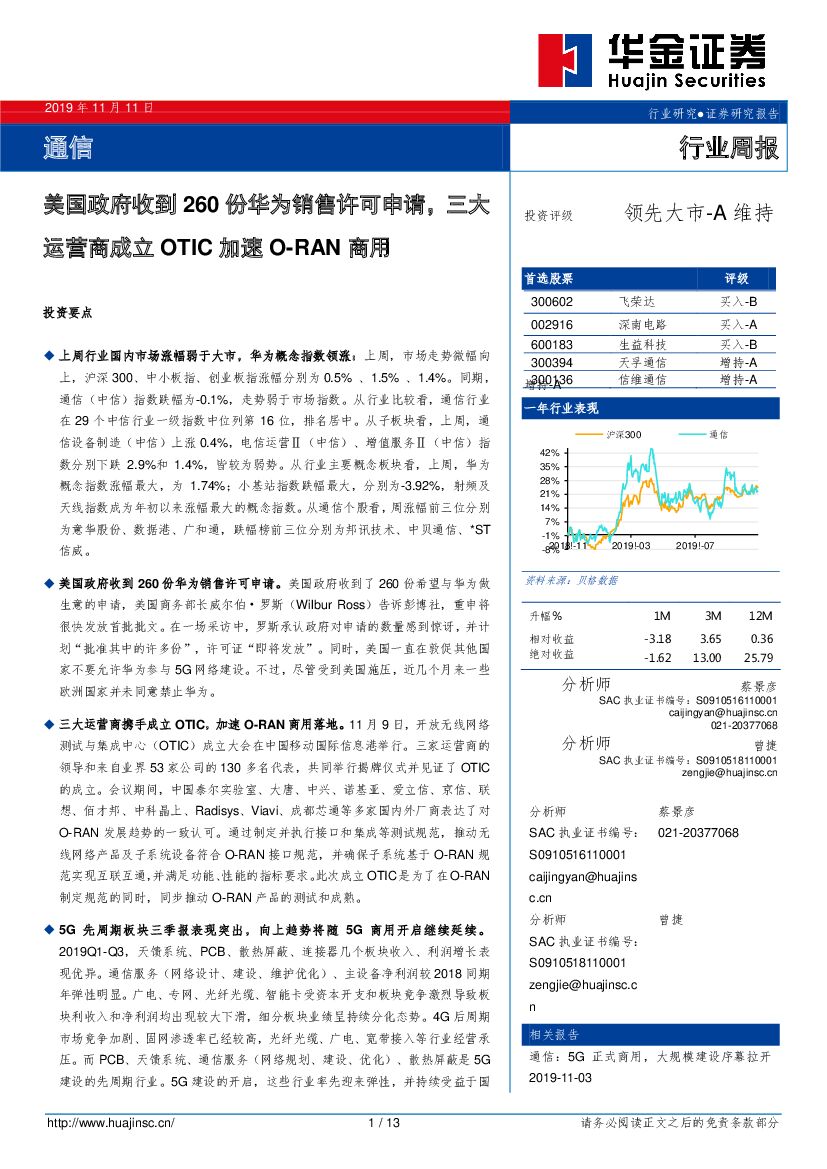 华金证券:通信行业周报:美国政府收到260份华为销售许可申请,三大运营商成立OTIC加速O-RAN商用.pdf