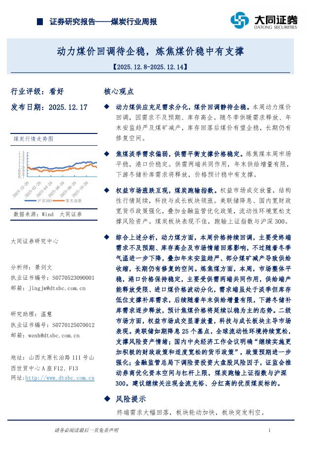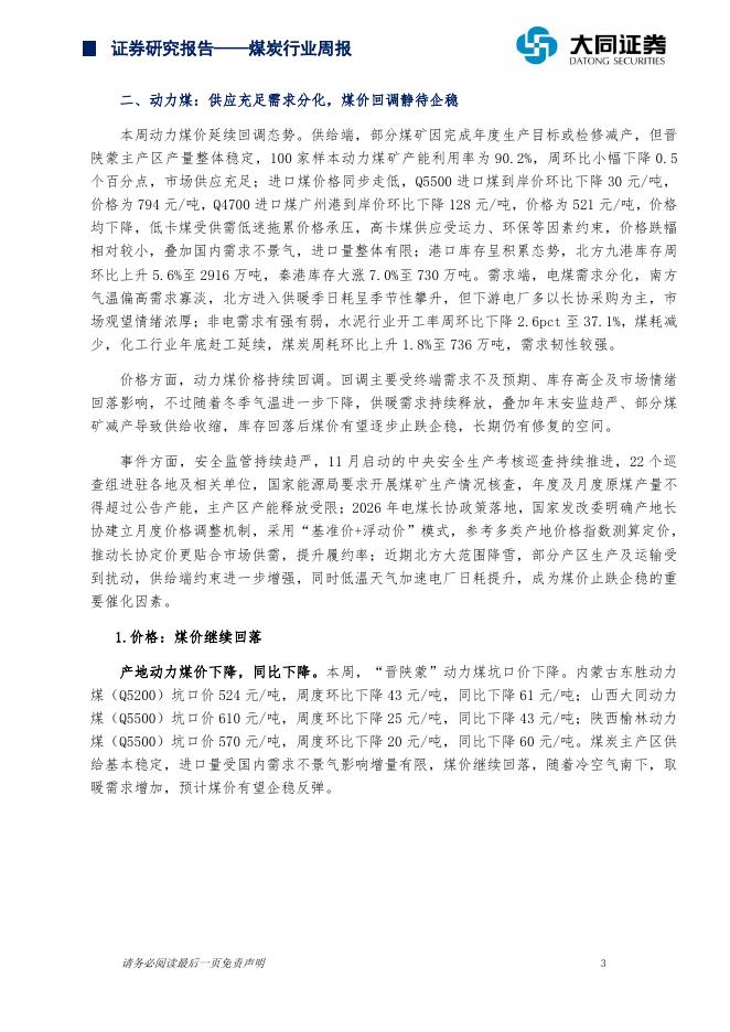 大同证券:煤炭行业周报:动力煤价回调待企稳,炼焦煤价稳中有支撑.pdf