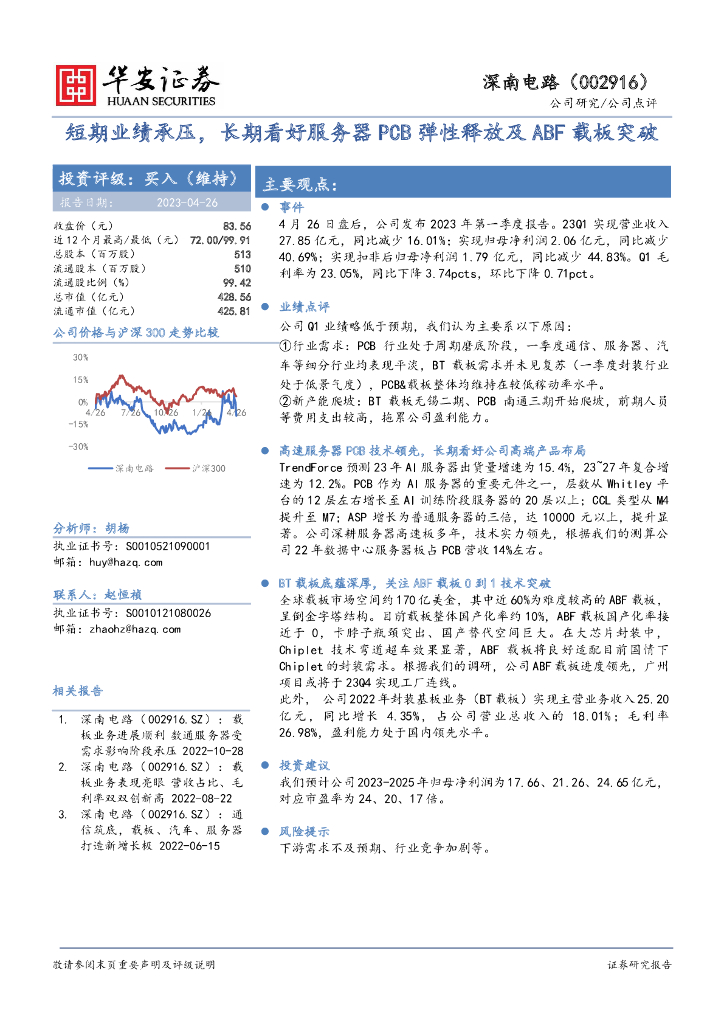 华安证券:深南电路(002916)-短期业绩承压,长期看好服务器PCB弹性释放及ABF载板突破.pdf