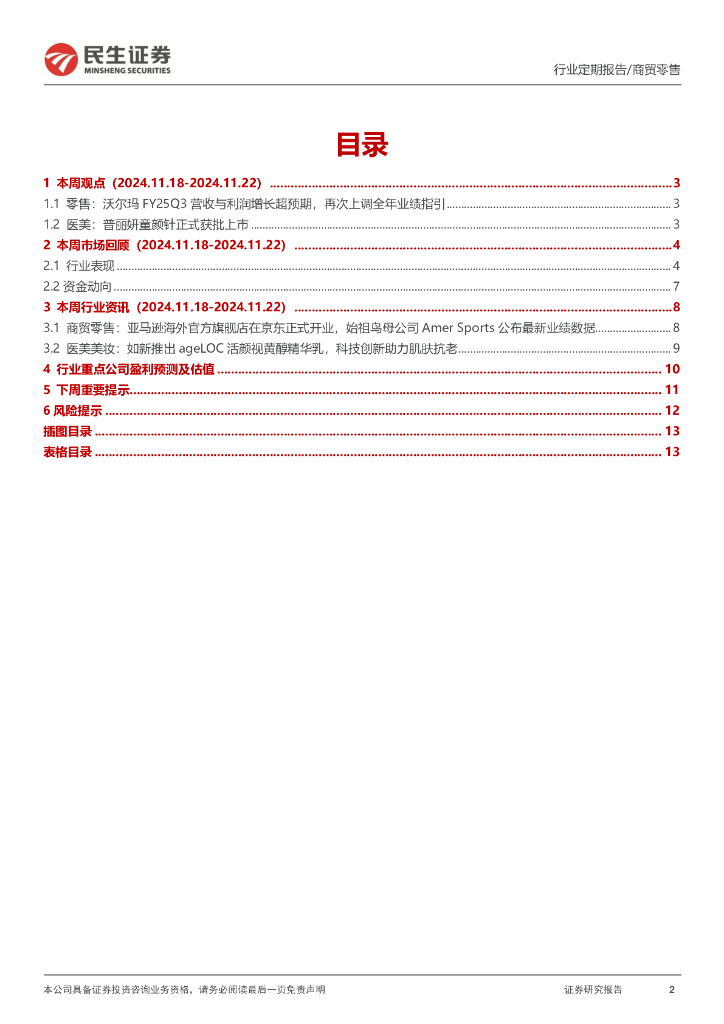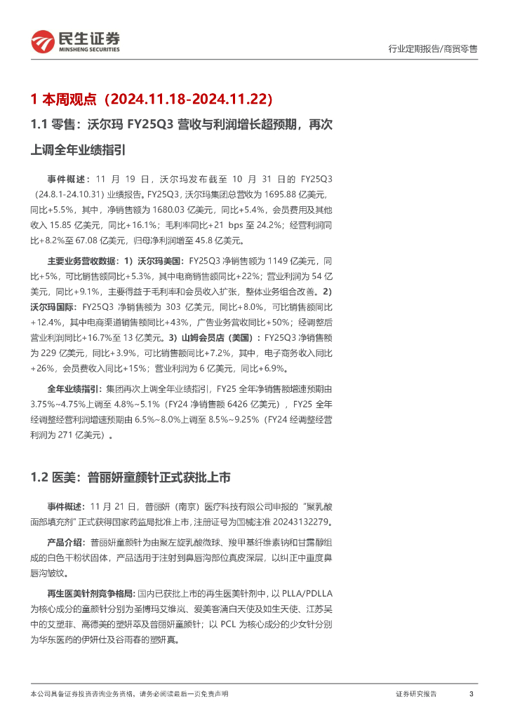 民生证券:零售周观点:沃尔玛再次上调FY25业绩指引,普丽妍童颜针正式获批上市.pdf
