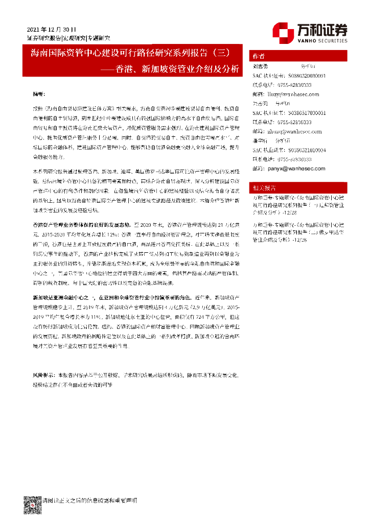 万和证券:海南国际资管中心建设可行路径研究系列报告(三):香港、新加坡资管业介绍及分析.pdf
