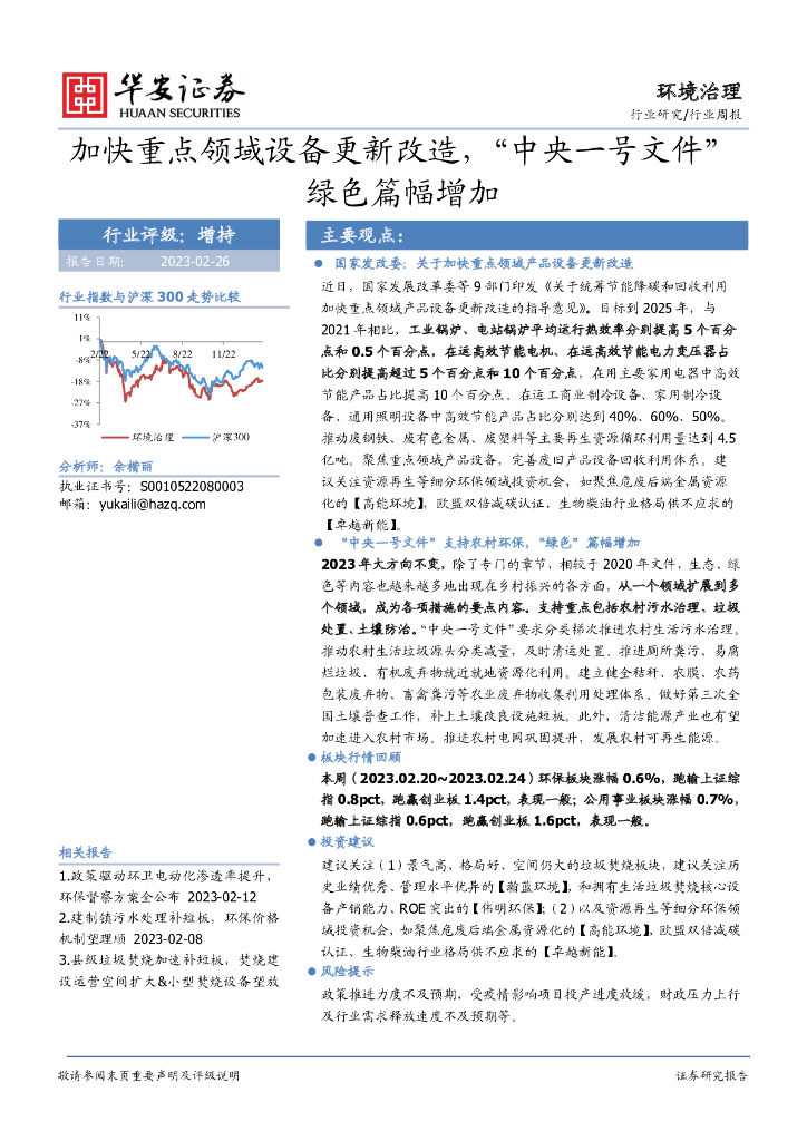 华安证券:环境治理行业周报:加快重点领域设备更新改造,“中央一号文件”绿色篇幅增加.pdf