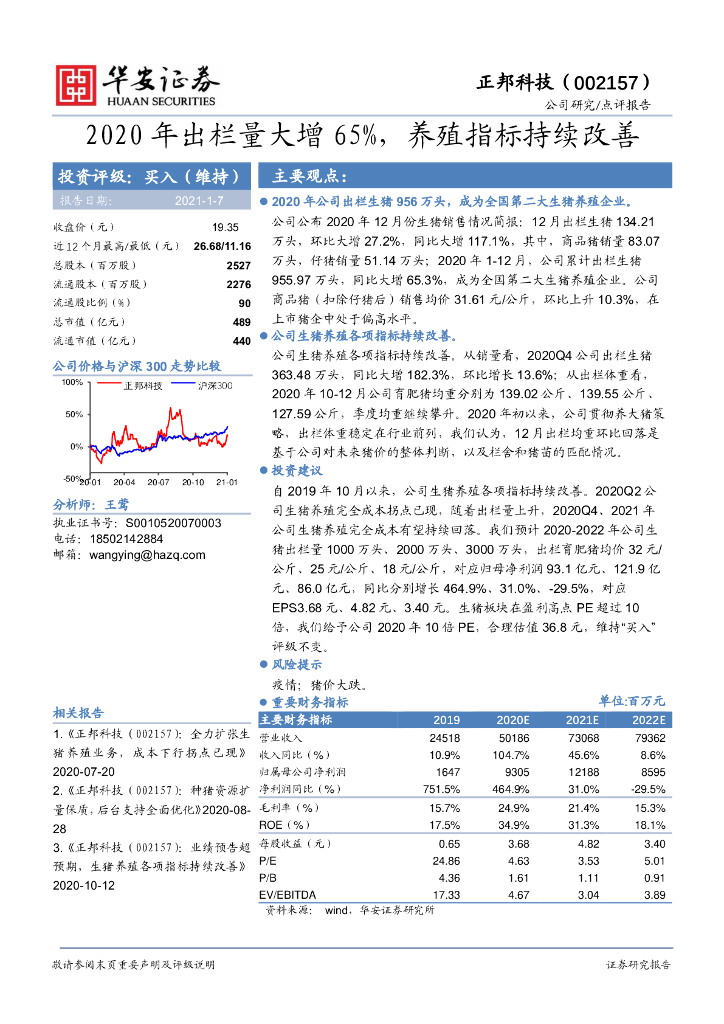 华安证券:正邦科技(002157)-2020年出栏量大增65%,养殖指标持续改善.pdf