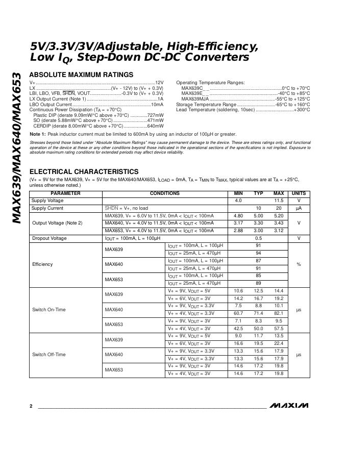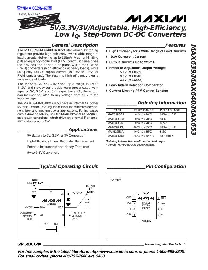 MAXIM MAX639/MAX640/MAX653 5V/3.3V/3V/Adjustable, High-Efficiency, Low IQ, Step-Down DC-DC Converters 数据手册.pdf