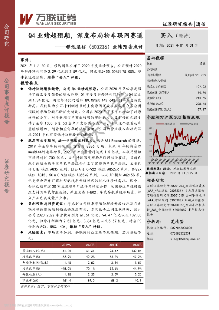 万联证券:移远通信(603236)-业绩预告点评:Q4业绩超预期,深度布局物车联网赛道.pdf