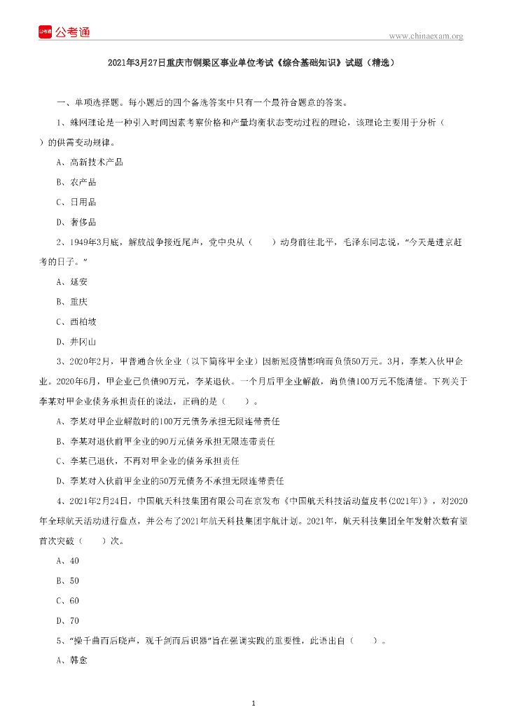 2021年3月27日重庆市铜梁区事业单位考试《综合基础知识》试题.pdf