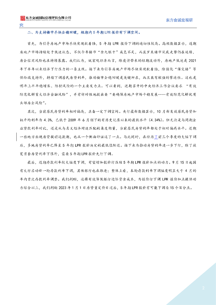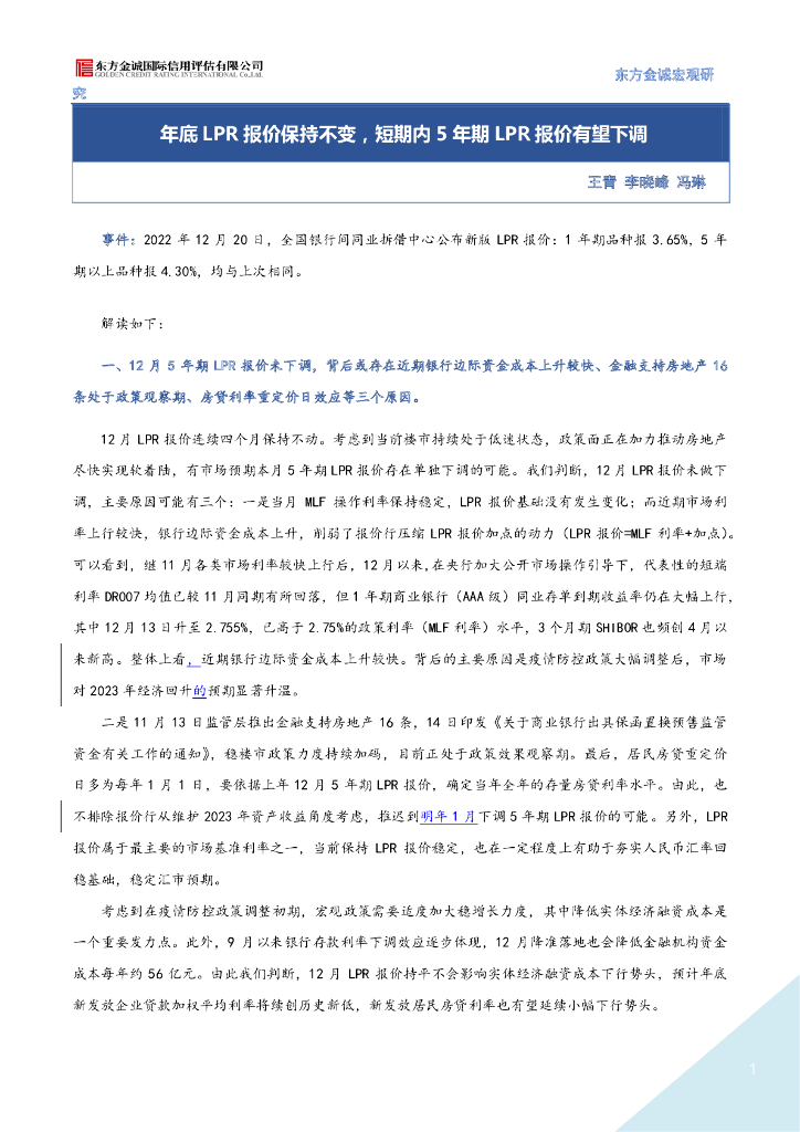东方金诚:年底LPR报价保持不变,短期内5年期LPR报价有望下调(2022年12月LPR报价点评).pdf