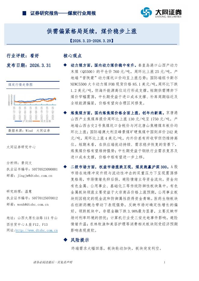 大同证券:煤炭行业周报:供需偏紧格局延续,煤价稳步上涨.pdf