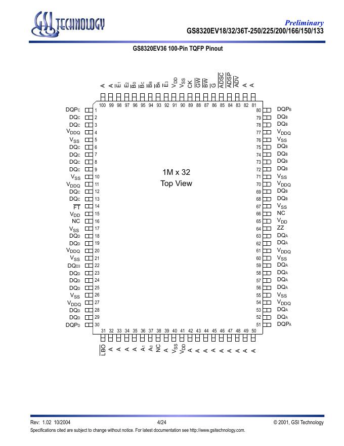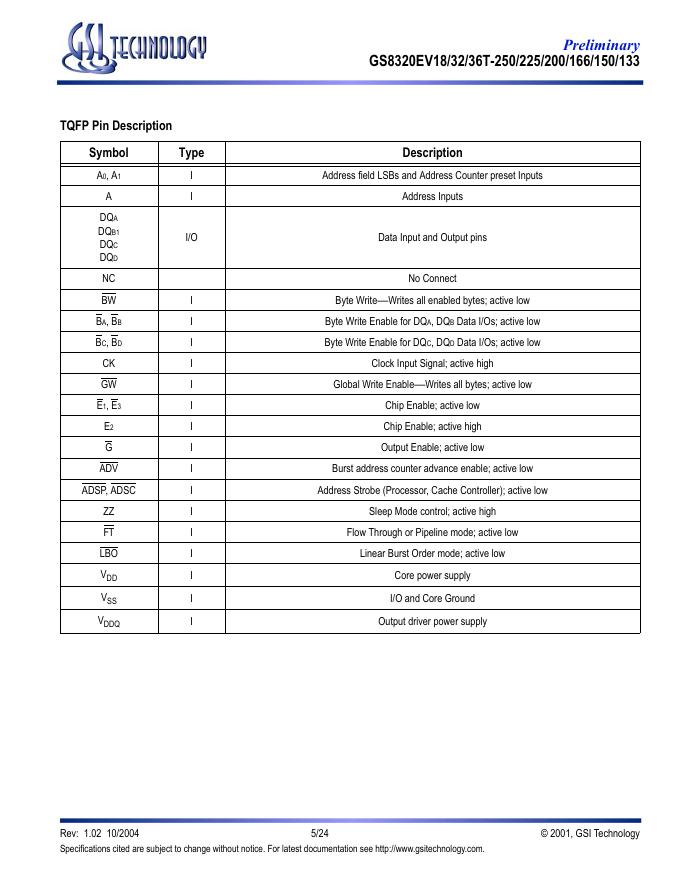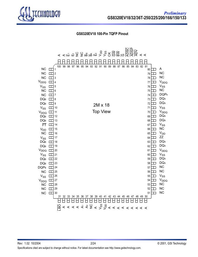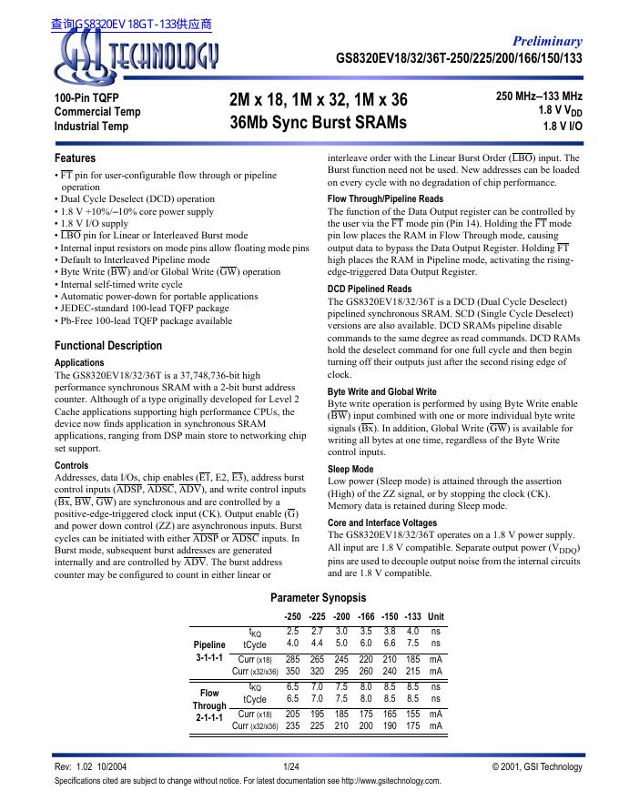 GSI TECHNOLOGY GS8320EV18/32/36T-250/225/200/166/150/133 数据手册.pdf