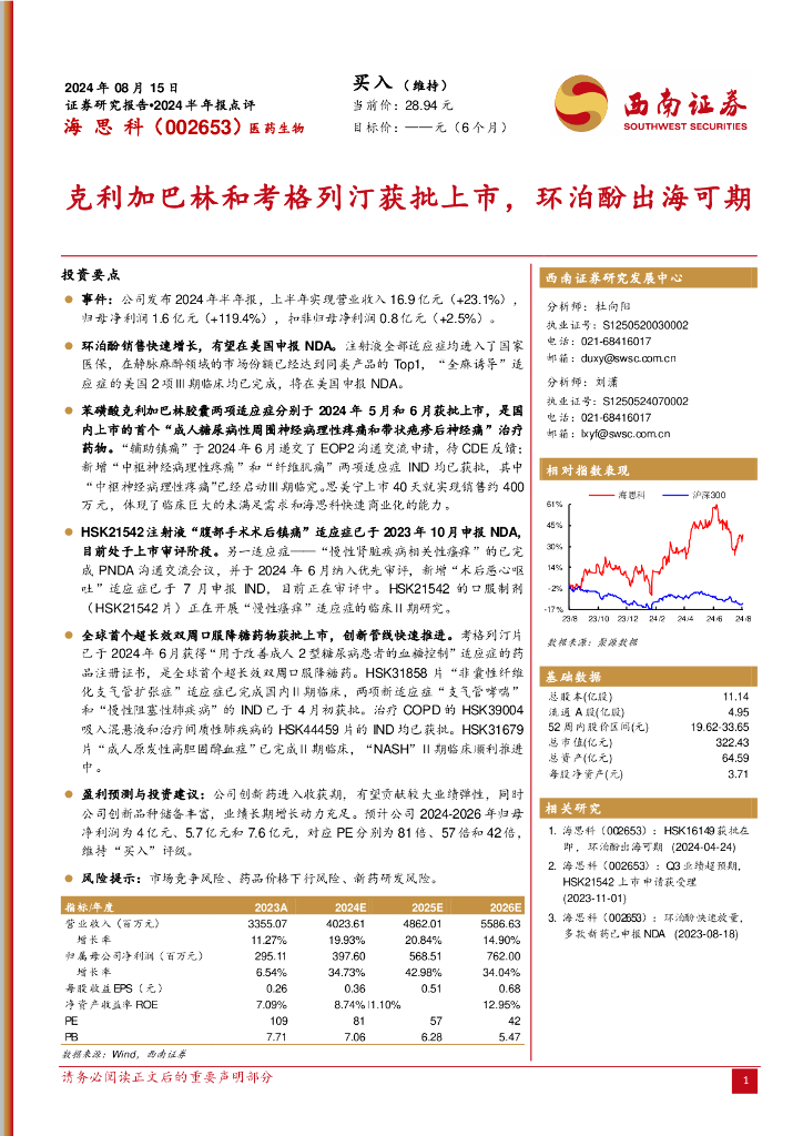 西南证券:海思科(002653)-2024半年报点评:克利加巴林和考格列汀获批上市,环泊酚出海可期.pdf