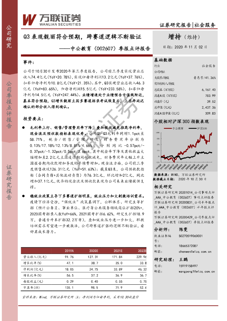 万联证券:中公教育(002607)-季报点评报告:Q3表现靓丽符合预期,跨赛道逻辑不断验证.pdf