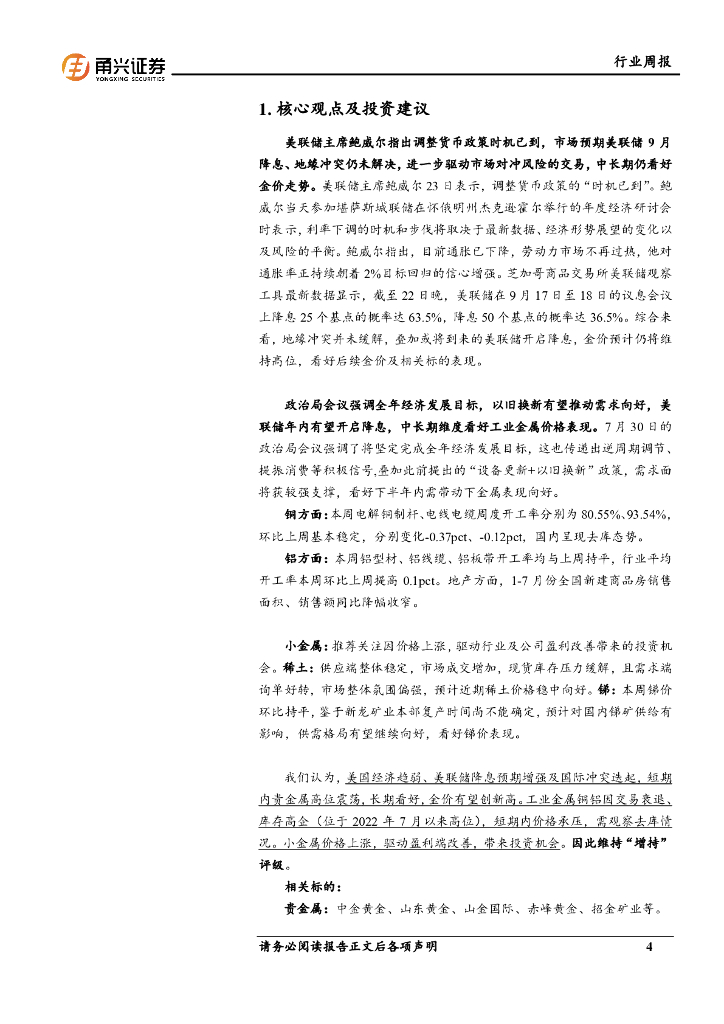 甬兴证券:有色行业周报:鲍威尔鸽派发言奠定九月降息基调,金价续创历史新高.pdf