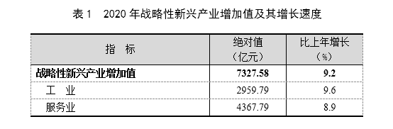全年战略性新兴产业增加值7327.58亿元,比上年增长9.2%。其中,工业增加值2959.79亿元,增长9.6%;服务业增加值4367.79亿元,增长8.9%(见表1)。
