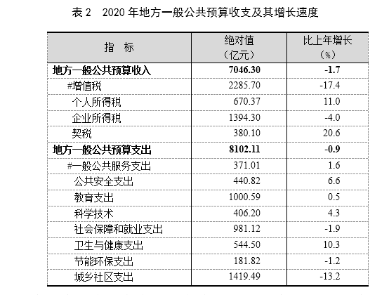 全年地方一般公共预算收入7046.30亿元,比上年下降1.7%;非税收入占全市地方一般公共预算收入比重为17.1%。地方一般公共预算支出8102.11亿元,下降0.9%(见表2)。全年税务部门组织的税收收入完成13052.72亿元(不含关税及海关代征税),下降4.7%。