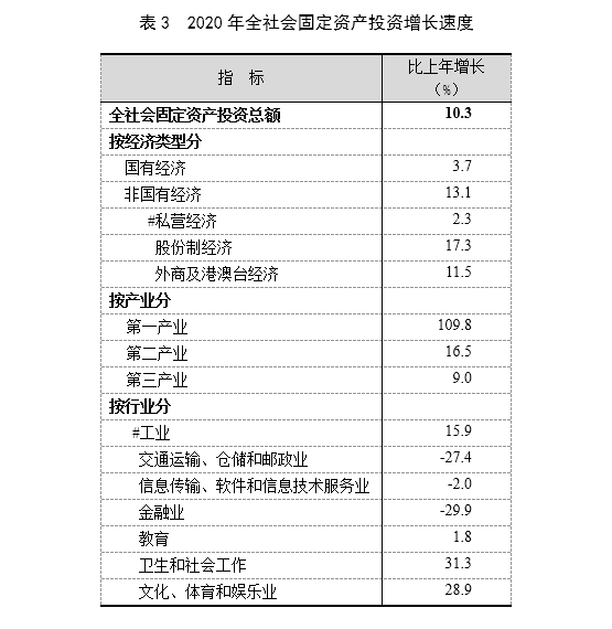 全年全社会固定资产投资总额比上年增长10.3%。其中,第二产业投资增长16.5%;非国有经济投资增长13.1%(见表3)。