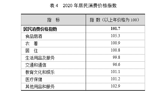 以上年价格为100,全年居民消费价格指数为101.7。其中,食品烟酒类价格指数为105.3,居住类价格指数为100.8,医疗保健类价格指数为101.2(见表4);工业生产者出厂价格指数为98.3,工业生产者购进价格指数为96.9。