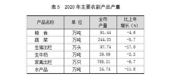全年全市农作物播种面积25.78万公顷,比上年减少2.5%。其中,粮食播种面积11.43万公顷,减少2.6%;蔬菜播种面积8.42万公顷,减少3.0%。全年全市粮食产量91.44万吨,比上年下降4.6%;蔬菜产量244.33万吨,下降5.7%;生猪出栏97.74万头,下降17.0%;生牛奶产量29.09万吨,下降2.2%;水产品产量24.74万吨,下降11.8%(见表5)。