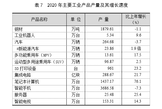 全年六个重点工业行业完成工业总产值23784.22亿元,比上年增长4.1%,占全市规模以上工业总产值的比重为68.3%(见表6)。全年规模以上工业产品销售率为99.4%。全年新能源汽车产量23.86万辆,增长1.9倍;3D打印设备产量961台,增长23.2%;集成电路产量288.67亿块,增长21.7%(见表7)。