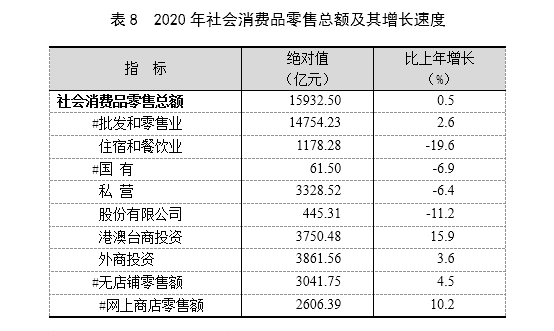 全年实现社会消费品零售总额15932.50亿元,比上年增长0.5%(见表8)。其中,无店铺零售额3041.75亿元,增长4.5%。网上商店零售额2606.39亿元,增长10.2%,占社会消费品零售总额的比重为16.4%。