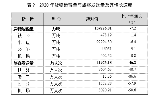 全年各种运输方式完成货物运输量139226.01万吨,比上年下降7.2%。旅客发送量11973.18万人次,下降46.2%(见表9)。