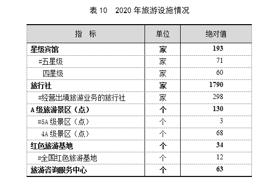 至年末,全市已有星级宾馆193家,旅行社1790家,A级旅游景区(点)130个,红色旅游基地34个(见表10)。
