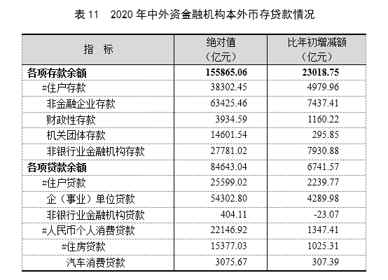 至年末,全市中外资金融机构本外币各项存款余额155865.06亿元,比年初增加23018.75亿元;贷款余额84643.04亿元,比年初增加6741.57亿元(见表11)。