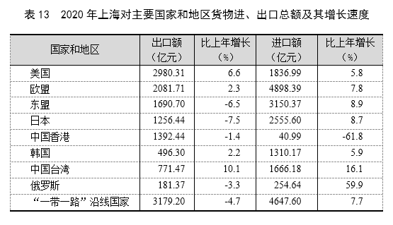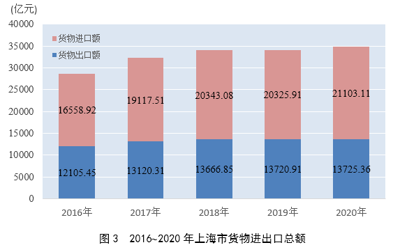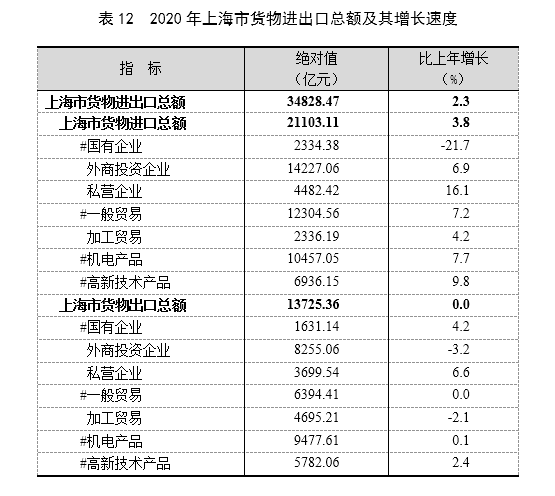 全年上海口岸货物进出口总额87463.10亿元,比上年增长3.8%,继续保持世界城市首位。其中,进口37648.80亿元,增长6.2%;出口49814.30亿元,增长2.1%。全年上海关区货物进出口总额64604.64亿元,比上年增长1.8%。其中,进口27024.82亿元,增长3.1%;出口37579.82亿元,增长0.9%。