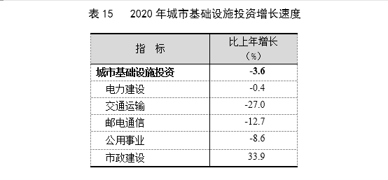 全年城市基础设施建设投资比上年下降3.6%。其中,电力建设投资下降0.4%;交通运输投资下降27.0%;公用事业投资下降8.6%;邮电通信投资下降12.7%;市政建设投资增长33.9%(见表15)。