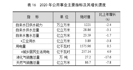 全市自来水供水能力为1221万立方米/日,与上年下降2.4%。全年供水总量为28.86亿立方米,比上年下降3.1%;售水总量为23.59亿立方米,下降1.7%。其中,工业用水量、生活用水量分别为3.89亿立方米、18.32亿立方米,分别下降3.8%和1.6%。全年全市用电量1575.96亿千瓦时,增长0.5%(见表16)。至年末,全市家庭液化气用户222万户,增长3.3%;家庭天然气用户753万户,增长2.7%。