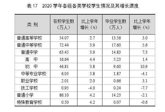 至2020学年末,全市共有普通高等学校63所,普通中等学校929所,普通小学684所,特殊教育学校31所。普通高等学校和中等职业学校在校生数及毕业生数有所增加(见表17)。全市共有49家机构培养研究生,全年招收全日制研究生6.33万人,在校全日制研究生17.81万人,毕业全日制研究生4.58万人。