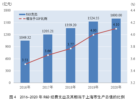 全年研究与试验发展(R&D)经费支出约1600亿元,相当于上海市生产总值的比例为4.1%左右(见图4)。
