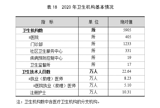 至年末,全市共有医疗卫生机构5905所,卫生技术人员22.64万人(见表18)。全年全市医疗机构共完成诊疗人次2.41亿人次;上海地区婴儿死亡率2.66‰;上海地区孕产妇死亡率3.66/10万,其中户籍人口孕产妇死亡率5.62/10万。