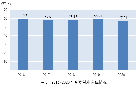 全年新增就业岗位57.04万个(见图5),就业困难人员实现就业6.33万人,新消除零就业家庭180户。全年帮扶引领成功创业12546人,其中,青年大学生9414人;帮助9956名长期失业青年实现就业创业。全年共完成补贴性职业培训176.25万人。其中,农民工补贴性职业培训95.7万人。高技能人才占技能劳动者比例达到35.03%。