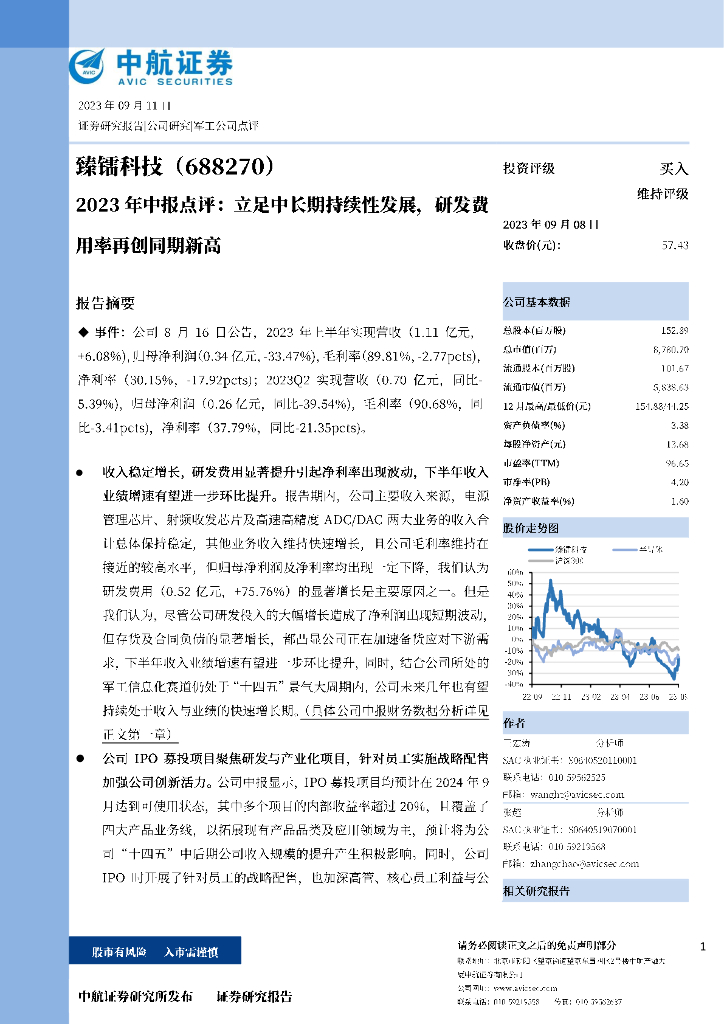 中航证券:臻镭科技(688270)-2023年中报点评:立足中长期持续性发展,研发费用率再创同期新高.pdf
