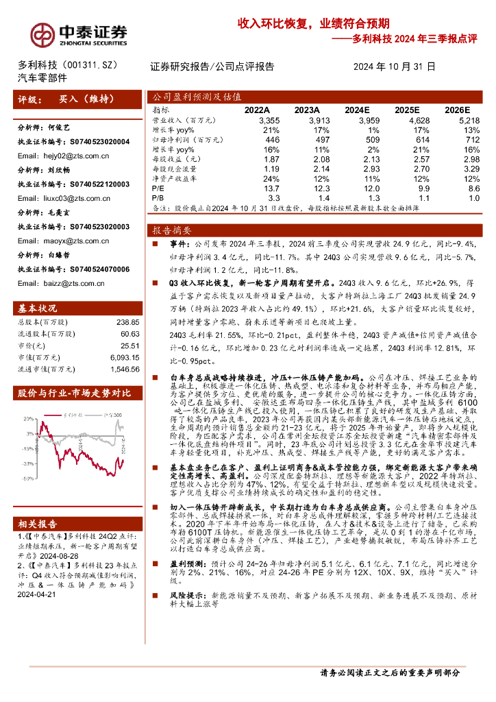 中泰证券:多利科技2024年三季报点评:收入环比恢复,业绩符合预期.pdf