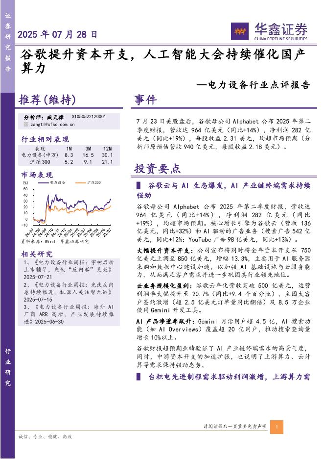 华鑫证券:电力设备行业点评报告:谷歌提升资本开支,人工智能大会持续催化国产算力.pdf