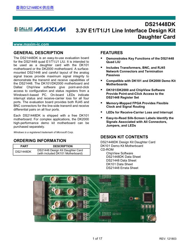 MAXIM DS21448DK 3.3V E1/T1/J1 Line Interface Design Kit Daughter Card 数据手册.pdf