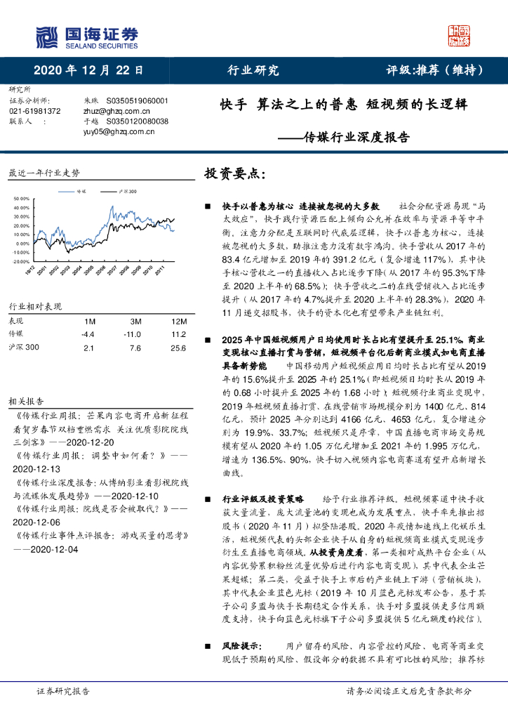 国海证券:传媒行业深度报告:快手 算法之上的普惠 短视频的长逻辑.pdf