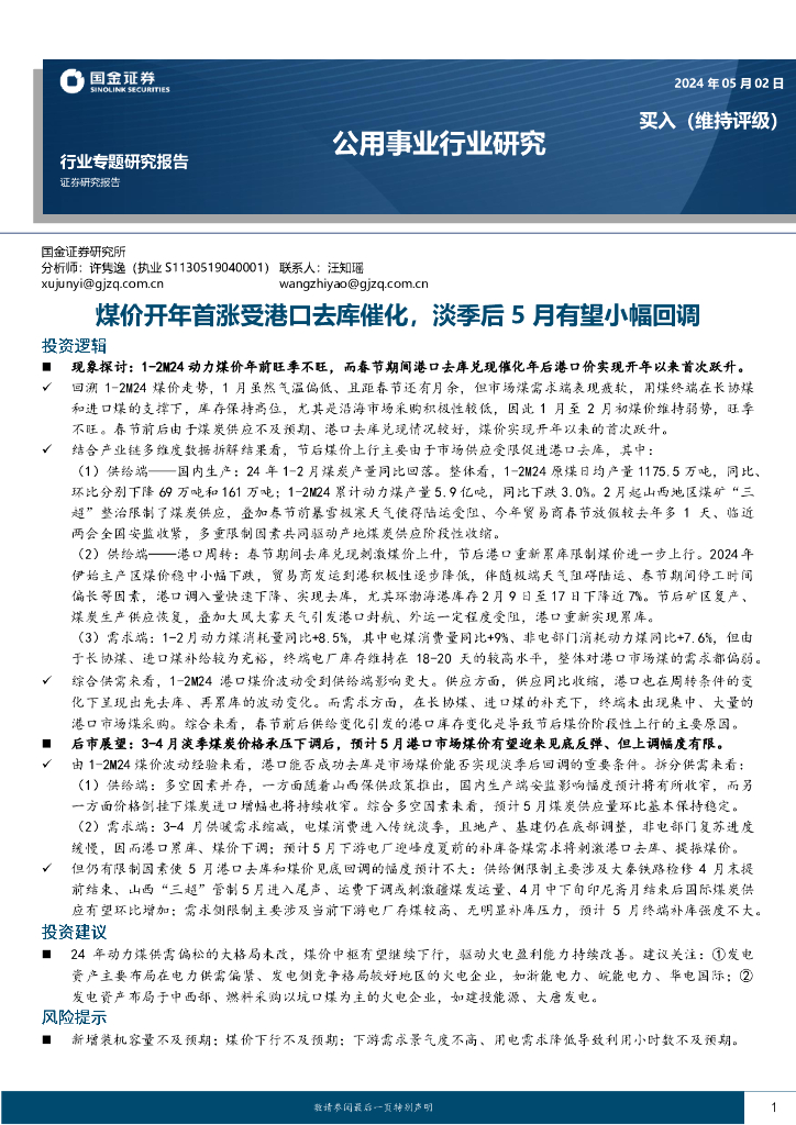 国金证券:公用事业行业研究:煤价开年首涨受港口去库催化,淡季后5月有望小幅回调.pdf