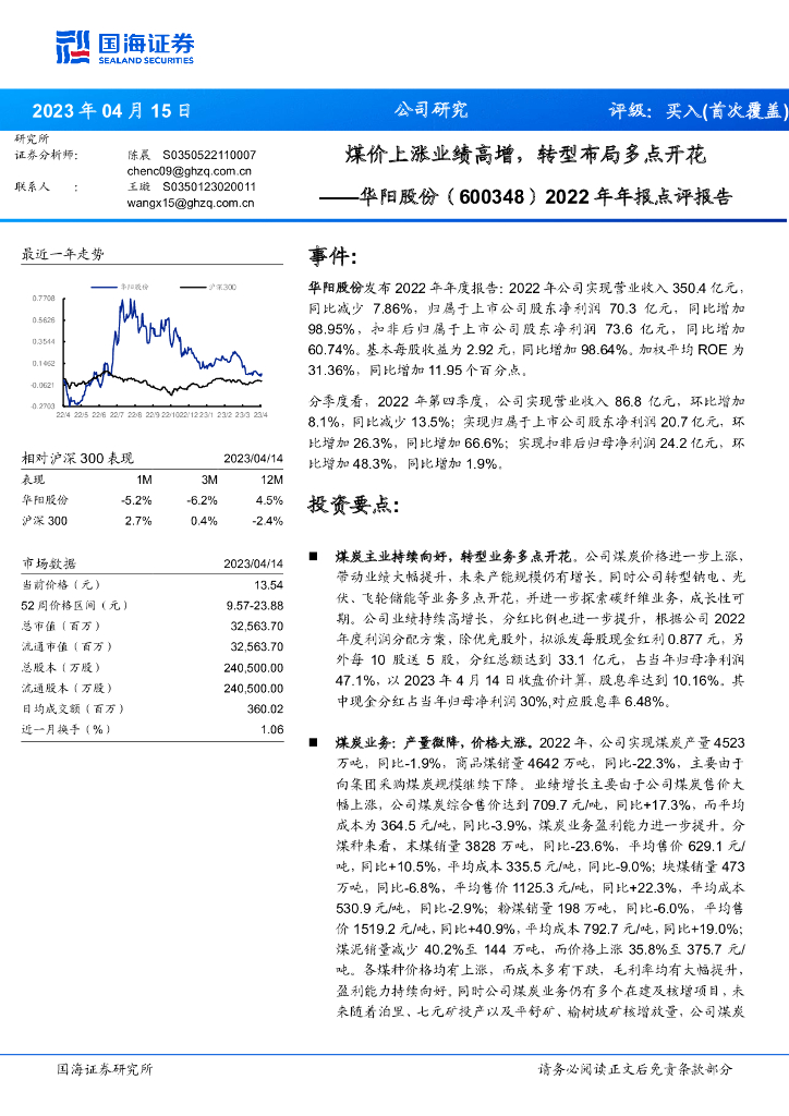 国海证券:华阳股份(600348)-2022年年报点评报告:煤价上涨业绩高增,转型布局多点开花.pdf