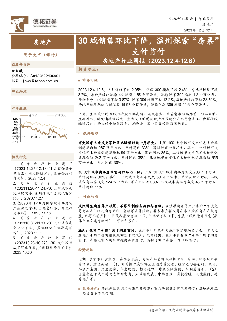 德邦证券:房地产行业周报:30城销售环比下降,温州探索“房票”支付首付.pdf