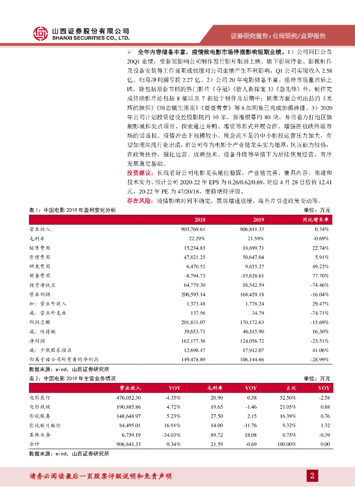 山西证券:中国电影(600977)-疫情影响业绩承压,长线看好全产业链生产经营能力.pdf