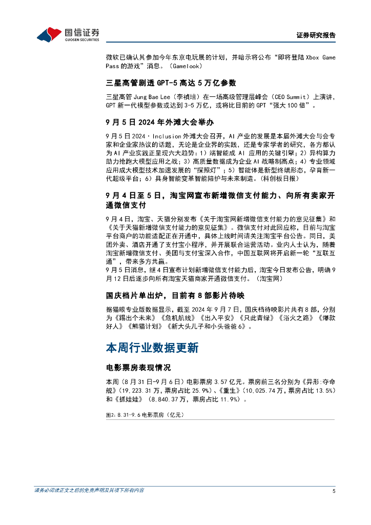 国信证券:传媒互联网行业周报:9月游戏版号发放、国庆档来临,持续看好游戏及影视行业机会