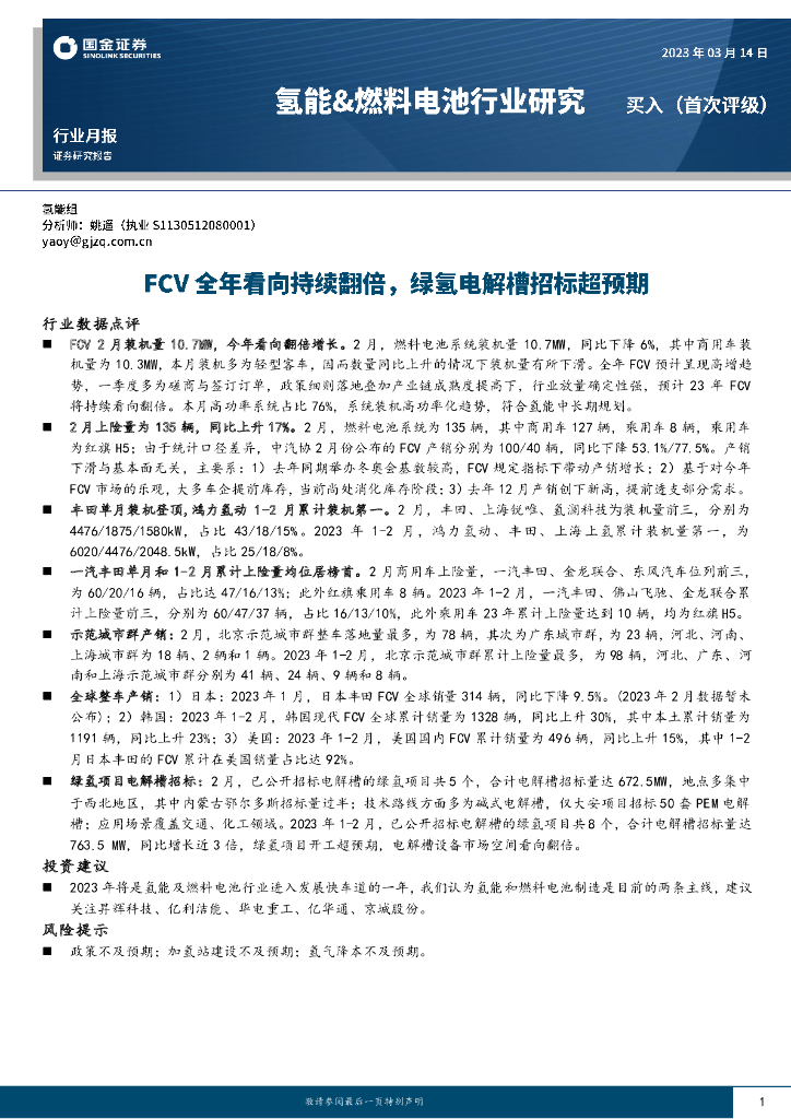 国金证券:氢能&燃料电池行业研究:FCV全年看向持续翻倍,绿氢电解槽招标超预期.pdf
