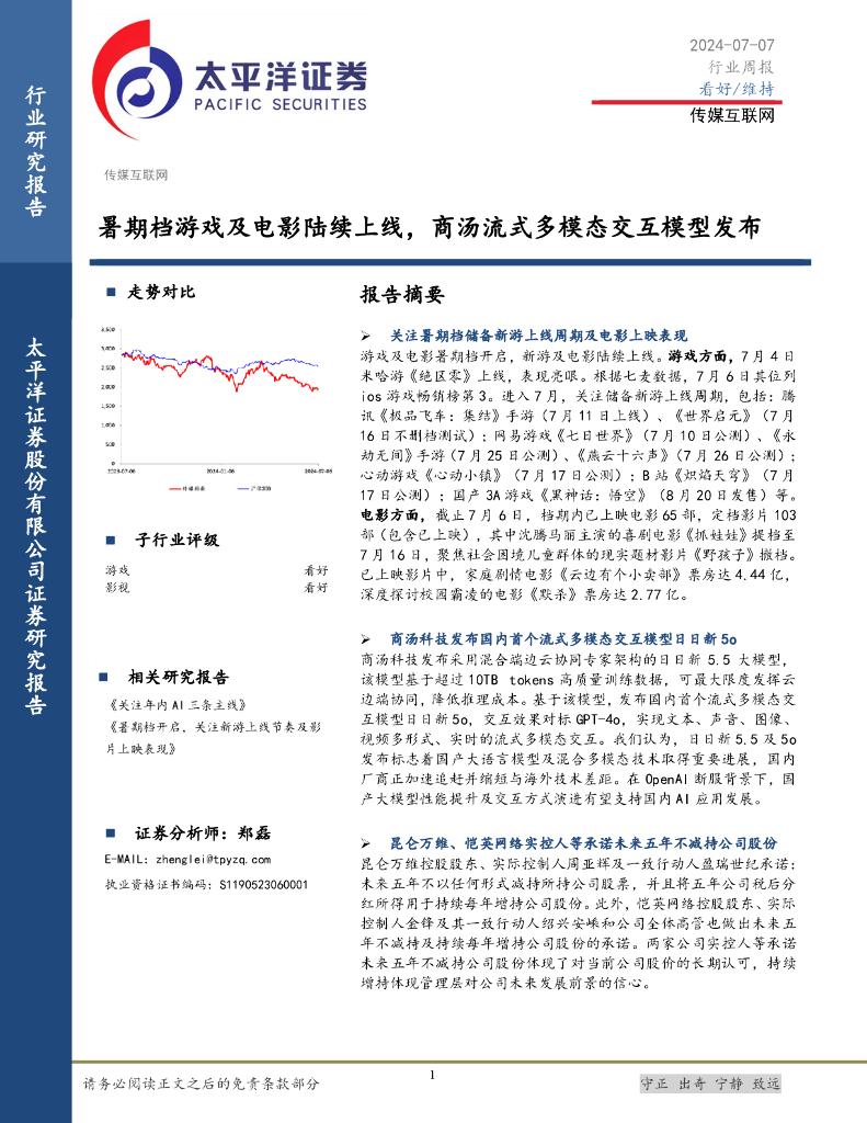 太平洋证券:传媒互联网行业周报:暑期档游戏及电影陆续上线,商汤流式多模态交互模型发布.pdf