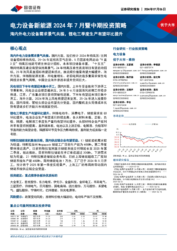 国信证券:电力设备新能源2024年7月暨中期投资策略:海内外电力设备需求景气共振,锂电三季度生产有望环比提升.pdf
